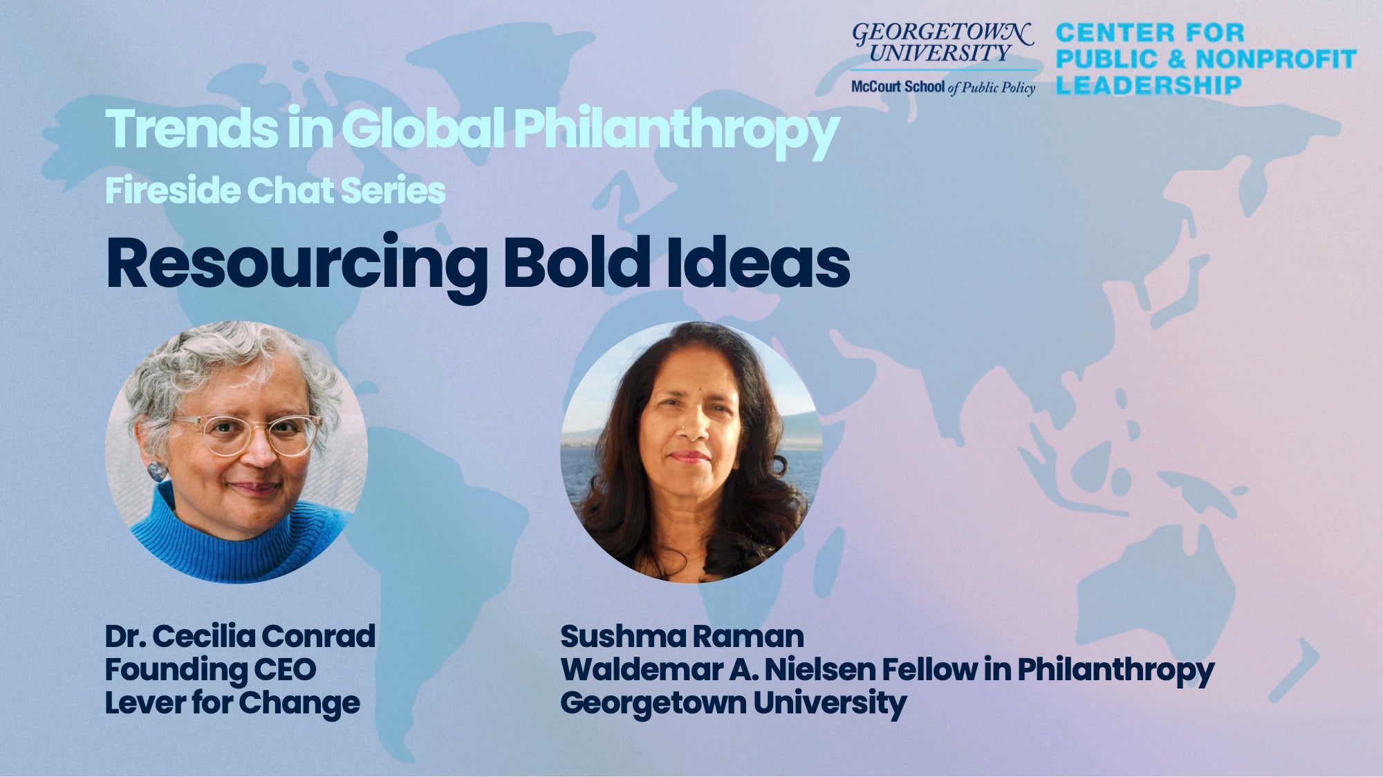 View the video of the inaugural fireside chat in our spring series on global philanthropy with Dr. Cecilia Conrad and Sushma Raman, Waldemar A. Nielsen Philanthropy Fellow.